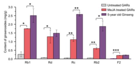 研究人员为了获得皂苷含量稳定、无农药残留、无重金属污染的人参总皂苷转化底物,开发了人参不定根的组织培养体系。从固体培养到液体培养,再到气升式反应器培养,人参不定根逐级放大,在获得的国家发明专利(ZL2011 1 0214567.5)5L生物反应器培养技术的基础上,扩大至10L,其中主要皂苷的含量通过茉莉酸甲酯的诱导后与5年生的野生人参基本一致。