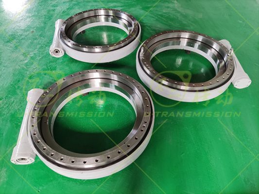 WEA35精密蜗轮蜗杆回转驱动客户用在重型设备上,要求回转精度≤0.05°,客户需要自锁,减速比大,高输出扭矩,所以给客户设计了WEA35精密蜗轮蜗杆驱动,涡轮采用42CrMo调制,齿淬火,蜗杆采用钢蜗杆,齿淬火,这样设计能提高单齿承载,最大限度提高驱动的输出扭矩。客户要求反向自锁,只能由蜗杆带动蜗轮,而不能由蜗轮带动蜗杆,这样在设备关机或者无动力的情况下仍能保证设备静止不动,非常安全可靠。蜗杆传动相当于螺旋传动,多齿同时啮合,传动平稳、噪音很小。