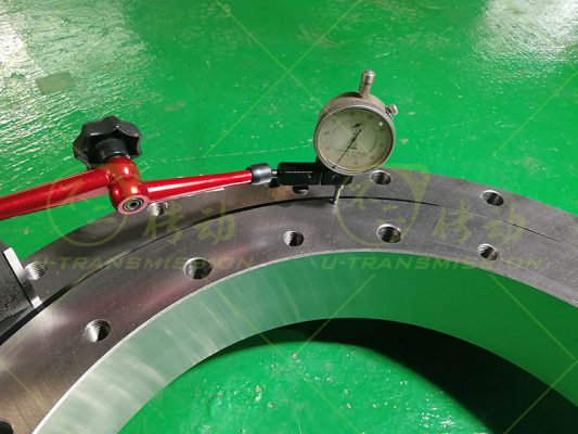 020.25.560 精密双排球回转支承客户用在破碎设备上,转速60转/分钟,由皮带轮直接带动旋转,双排球回转支承具有转速高,载荷大,抗倾覆能力好,运转平稳等特点,加工的难点是保证两排沟道位置一致还需要保证两排沟道平行,只有这样两排钢球才能同时受力,才是真正意义上的双排球,加工不好的话只有一排钢球受力,就变成单排球回转支承了,失去了使用双排球回转支承的意义。