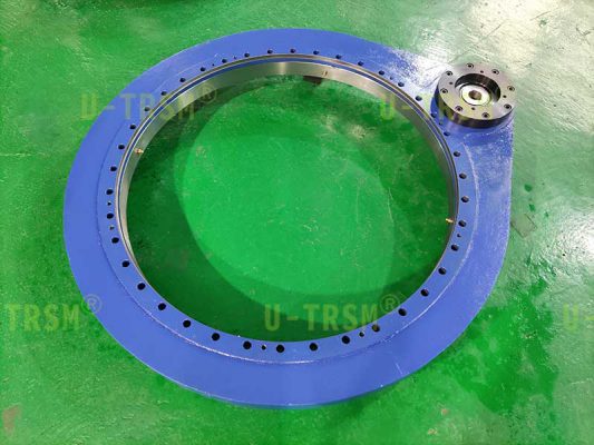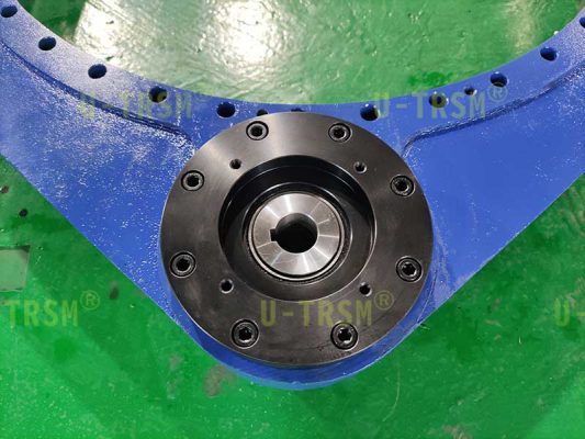 为了达到需要的减速比,在回转驱动上面又连接了一个行星减速机,这一套装置需要用伺服电机来驱动。因此,我们为客户适配了减速机的连接法兰和输出轴,客户可以直接把减速机连接到回转驱动上使用,非常方便。