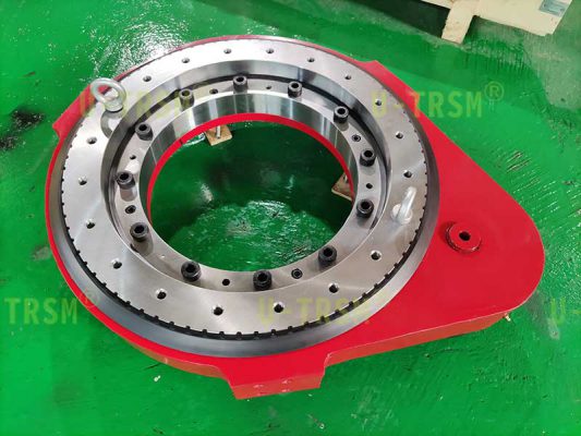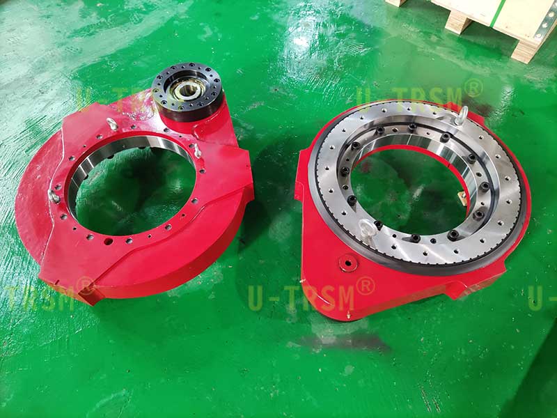S-III-O-0510 竖直支撑齿轮式回转驱动使用在工业自动化领域,水平安装使用,但是固定回转驱动的螺栓不能在回转驱动底部,只能在回转驱动侧面,客户通过壳体侧面的螺栓孔固定回转驱动,回转驱动外圈带动设备的旋转部分旋转。使用环境多粉尘,要求回转驱动具有防尘性能。