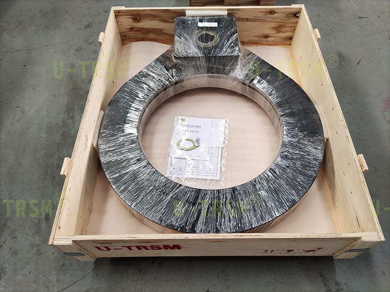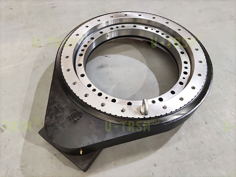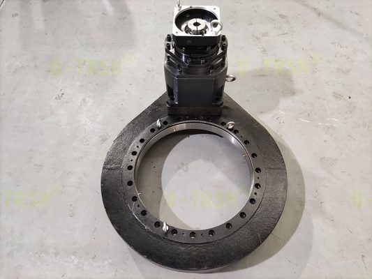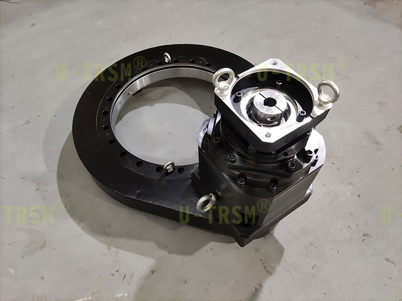 S-III-O-0655 配套三级减速机的精密磨齿回转驱动应用在智能制造车间的设备上,客户使用普通电机带动回转驱动旋转,到达指定位置后停止,要求回转驱动输出转速非常低,到达指定位置后转台不能有较大晃动。