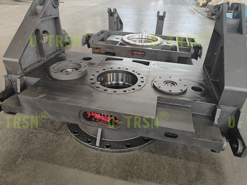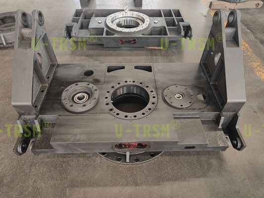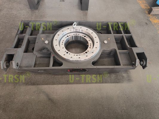 此款回转驱动应用在自动化旋转平台设备中,两侧支臂孔与平台孔成角度,用于连接举升设备使用,此驱动与平台集成一体化设计,节省设备安装空间,避免过多的安装配合造成的误差累计增加。