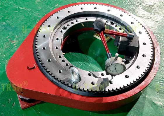 这款回转驱动内部的回转支承是负游隙,还对齿进行磨齿加工。所谓的负游隙就是回转支承的滚动体和沟道过盈配合,这样的配合可以保证内圈和外圈之间没有晃动,检测表现为测量回转驱动的游隙为零,负游隙的回转支承运转平稳,不会损失回转精度。