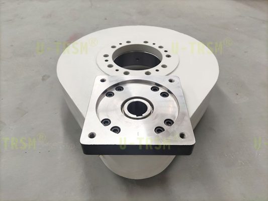 回转驱动负责带动四工位工作台旋转,到每个工位停止一段时间后,自动旋转到下一工位,如此循环使用。工作台旋转的时候有较大的偏载,需要大的扭矩才能顺利转动工作台。